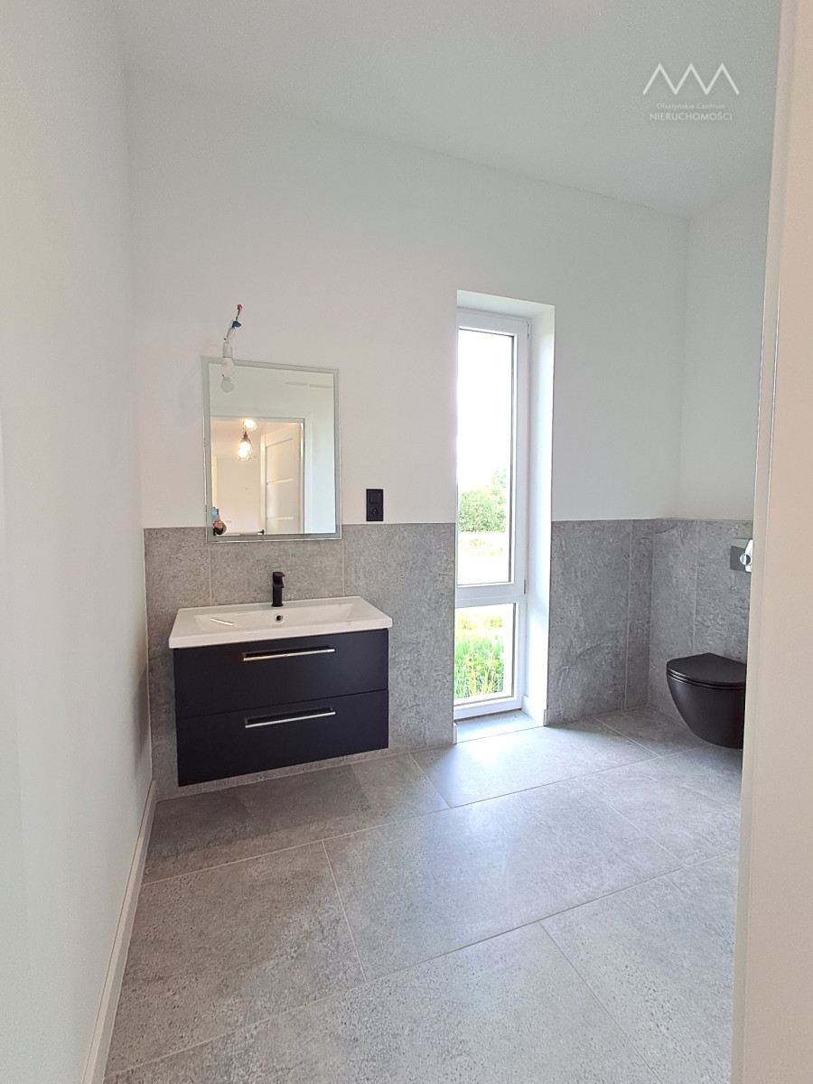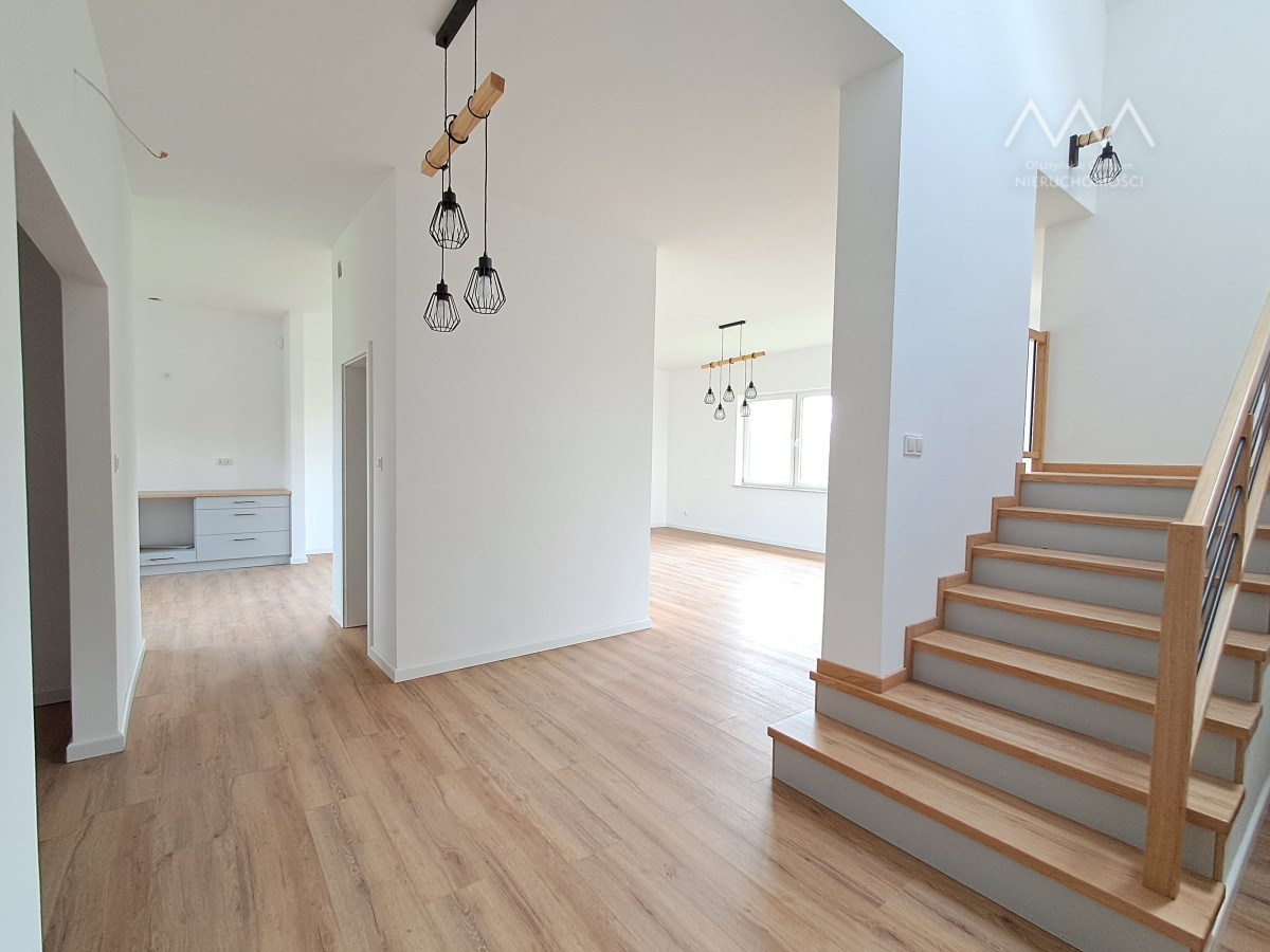Dom wybudowany w technologi tradycyjnej  w pełni wykończony: panele wysokiej jakości ,  ściany pomalowane, schody drewniane, łazienki z prysznicami, kuchnia w zabudowie z sprzętem AGD, oświetlenie: