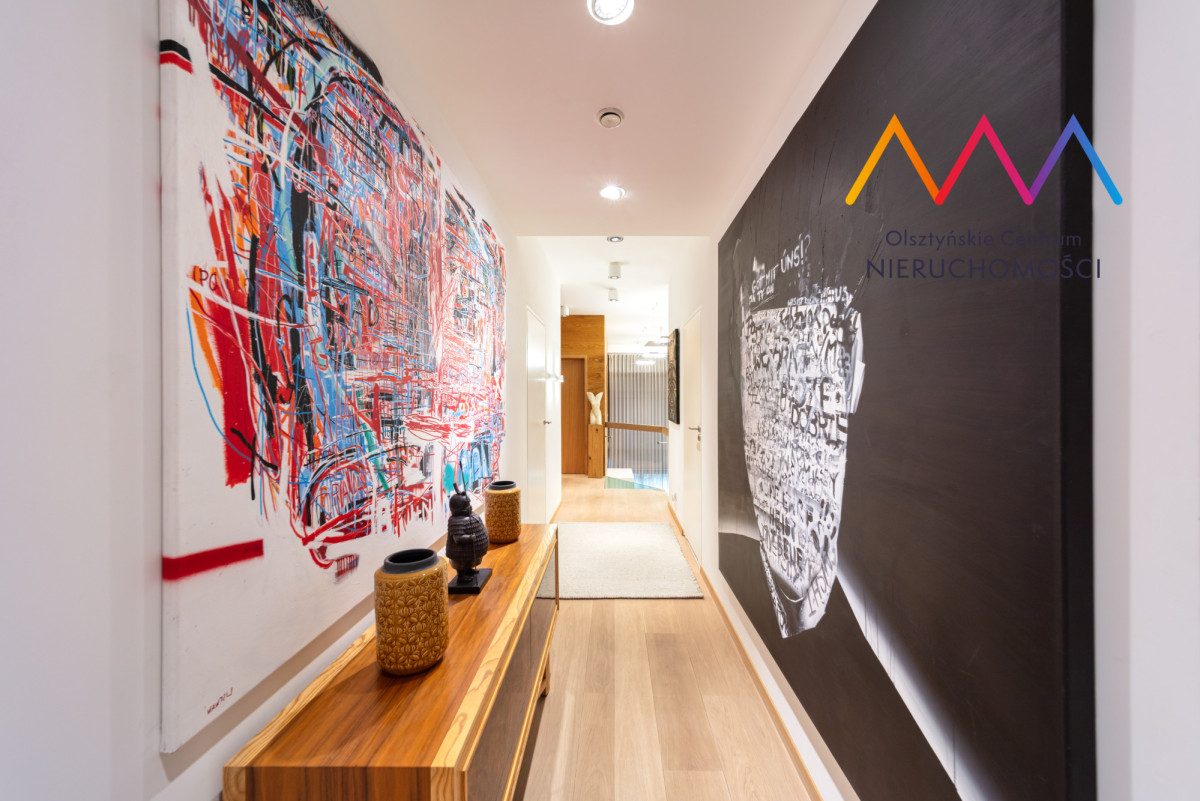 - Centralnym elementem wnętrza jest antresola oraz efektowna, sześciometrowa ściana okien, wyposażone w zasłony sterowane za pomocą aplikacji